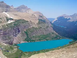 Helen Lake is located in Glacier National Park, in the U.S. state of Montana. Helen Lake is at the head of the Belly River and is situated below Ahern Peak to the west and Ipasha Peak to the northwest.[2] Numerous small streams feed the lake in addition to melt waters from the Ahern Glacier which descend 1,680 feet (510 m) over Ahern Glacier Falls in one sheer drop to a talus slope below en route to the lake.[3]