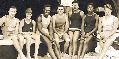 Hawaiians who qualified for the 1920 Olympic try-outs shown left to right: Ludy Langer, Helen Moses, Duke Kahanamoku, George "Dad" Center, Warren Kealoha, Pua Kealoha, and Bill Harris. Her coach at the Outrigger Club, George Center, would also serve as an Assistant swimming coach in the 1920 Antwerp Olympics.[6]