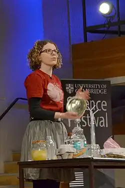 In October 2011, she appeared on BBC Radio 4's The Museum of Curiosity. Her hypothetical donation to this fictional museum was a tank full of seahorses.[5] In 2013 she spoke at a TEDx event, TEDxLSE, at the London School of Economics.[6] In April 2018, she was a judge for the UK finals of the FameLab competition.[7] In 2021 she was a guest on the BBC Radio 4 programme The Life Scientific.[1]