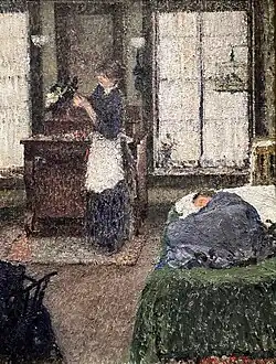 With its "broken" technique, blonde palette, and concern with the effect of light on her subjects, Turner's style has been described as Impressionistic. Unusually, it seems to have been developed almost exclusively in the United States, with few outside influences noted.[3] None of her early work, from her first years in New Orleans, is known to survive; it is believed to have likely been academic in nature given what is known of her first instructors. Of her later teachers, she gave credit only to Volk and to Cox for the development of her style.[4] Her work has been described as "unpretentious" and revealing, "unconsciously, a woman's point of view."[4] Her subjects were frequently women, often depicted in musical pursuits.[6] She experimented with tapestry work as well; a small number of piece worked with her sister Lettie are still known to exist.[10]