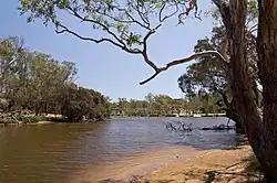 ![]() The Helena River at Mundaring Weir. The building on the right is the original Number 1 pump station for the Goldfields Pipeline. | |