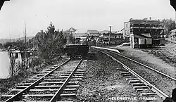 Helensville South was the original terminus from Thursday, 28 October 1875,[16] when the 16.5 mi (26.6 km) Kaipara – Riverhead line opened, with a daily train each way from Friday, 29 October.[17] It was near Rimu Street,[18] 0.7 km (0.43 mi) south of the later Helensville station.[2] A Kaipara River wharf, accessible only at high tide,[19] was built in 1872 and a goods shed and station house in 1873. Initially journeys were slow, as there was no ballast, sleepers being held only by clay and fern. On 25 July 1876 Helensville South was described as a temporary station. The town grew up close to the old station, so that there was opposition to closing it. In October 1880 a petition asked for a small platform and in July 1881 another petition opposed closure. Therefore, on 9 February 1881, when the new terminus opened, the old Helensville station became Helensville South flag station. A platform was built later that year, a ticket office in 1884, by which time there was also a cart approach, and a shelter shed in 1887. By 1896 there were also urinals and private sidings for Helensville Timber Co and Waitemata County Council, with a siding for Kaipara Dairy added when their factory opened in 1911, on the site of a sawmill.[20] In 1912 a 20-ton weighbridge was added.[21] A light was added in 1921.[22] The Mill Road level crossing was replaced by a bridge in 1938.[23] By 1978 only a shelter shed remained.[21] Both stations lost their passenger trains to the north from 31 July 1967, general goods traffic from 9 July 1978 and Auckland suburban trains from 30 November 1980.[1]