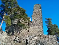 The castle is situated on top of a rock, which today is partially hidden by forests. In front of the castle there used to be a fortressed village. The castle has a circular floor plan. The entrance to the castle led through a bridge over a deep ditch and intermittent rocks, and is surrounded by walls. The entrance through the first door once led over the floating bridge.