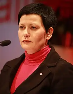 On the local level she was a deputy member of Finnmark county council from 1999 to 2003, and county mayor from 2003 to 2005.[3] In 2007 she was elected as deputy leader of the Labour Party, as the first woman with Sámi background to hold this position.[4] Following the 2009 election, Pedersen was chosen to be the parliamentary leader for the Labour Party in the Storting. She therefore resigned as fishery minister and left the cabinet.[5] She remained in this capacity until the election defeat in the 2013 parliamentary elections, when former prime minister Jens Stoltenberg returned to the parliament.[6]
