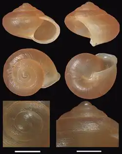 | Different views of a shell of Helicina schereri, from Brazil; top left = apertural view; top right = left lateral view; middle left = apical view; middle right = umbilical view; bottom left = detail of protoconch; bottom right = detail of spire (scale bars = 0.5 mm). | |