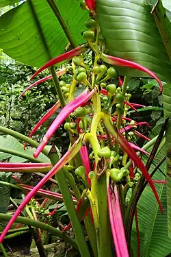 Heliconia aemygdiana is a species of flowering plant in the family Heliconiaceae. It is a rhizomatous geophyte found in tropical South America.[1] It has a cucumber-like aroma.[2]