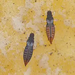 Adults have black thoraxes and yellow to dark brown abdomens,[10] but at the ends of their abdomens, they have an orange coloured tip.[6] Greenhouse thrips have a 10-segmented abdomen.[9] The bodies of the H. haemorrhoidalis are covered with cuticles that have an average thickness of 7.5 micrometers.[9] Their epidermis is made up of flattened cells and have a thickness of 3 micrometers.[9] The forewings of the H. haemorrhoidalis are very narrow and contain few short setae on the veins.[6] The legs of the greenhouse thrips have only a single-segmented tarsi.[6] The body length of an adult H. haemorrhoidalis varies between 1.2 and 1.8 mm long as adults.[6][9][10] The three pairs of legs on an adult is white in colour.[8]