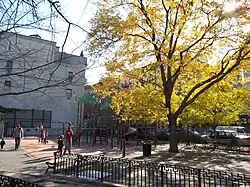 A lone surviving structure from the time this area was open farmland and suburban villas is a pre-1800s carriage house that once belonged to a villa owned by former Vice President and New York State governor George Clinton, now in a narrow court behind 422 West 46th Street.[23] From 1811 until it was officially de-mapped in 1857, the diminutive Bloomingdale Square was part of the city's intended future. It extended from 53rd to 57th Streets between Eighth and Ninth Avenues. It was eliminated after the establishment of Central Park,[24] and the name shifted to the junction of Broadway, West End Avenue, and 106th Street, now Straus Park.[25]