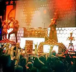 In addition, Zombie performed three festival dates and performed at the Revolver Golden Gods Awards ceremony. The Gruesome Twosome tour was Zombie's first to feature Joey Jordison, who replaced Tommy Clufetos.[10] The tour began to incorporate a new stage setting and use of theatrics, much similar to Zombie's earlier tours. The band also filmed the video for Mars Needs Women during this leg of the tour.[11]