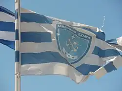 Flag of the Hellenic Coast Guard flown in front of the Coast Guard offices in Rethymno Harbour.