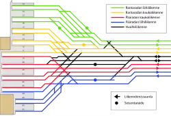 A schematic map of the tracks at the Helsinki Central Station. Green lines denote commuter traffic on the Rantarata line, yellow lines denote long-distance traffic on the Rantarata line, red lines denote long-distance traffic on the Finnish Main Line, blue lines denote commuter traffic on the Finnish Main Line, and black lines denote service traffic. Arrows denote the direction of traffic and spheres denote stabling tracks.
