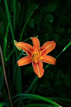 Hemerocallis fulva, the orange day-lily,[3] tawny daylily, corn lily, tiger daylily, fulvous daylily, ditch lily or Fourth of July lily (also railroad daylily, roadside daylily, outhouse lily, track lily, and wash-house lily), is a species of daylily native to Asia. It is very widely grown as an ornamental plant in temperate climates for its showy flowers and ease of cultivation. It is not a true lily in the genus Lilium, but gets its common name from the superficial similarity of its flowers to Lilium and from the fact that each flower lasts only one day.