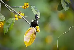 These woodpeckers forage in pairs, sometimes joining mixed-species foraging flocks. They fly from tree to tree in a sharply bounding flight giving a head-heavy appearance. They forage on thin branches and call often. They feed mainly on insects under bark but have been known to peck the pods of Cassia fistula to obtain insect larvae.[16] The calls include a sharp twee-twee-twee (duet call) sometimes leading to a trill of several notes,[17] a nasal ki-yeew[18] and repeated su-sie calls.[19] They drum infrequently during the breeding season, mainly during winter and before the Monsoons. The nest is bored in a dead branch with a narrow 3 to 4 cm diameter opening and the tunnel going down obliquely about 20 cm before widening into a chamber. Nests may sometimes be built in fence posts.[20] The usual clutch is two or three eggs, which are unmarked white.[10] Ticks of the species Haemaphysalis spinigera have been noted on these birds.[21]