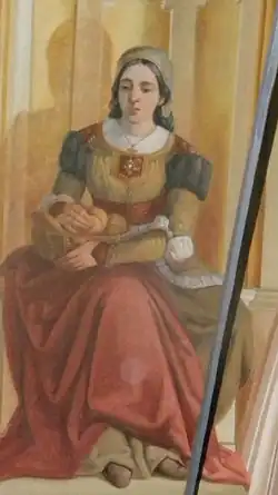 | Attributes | Depicted as a noble lady with either a model of a church, a legal deed or a rose, or distributing alms. |