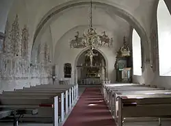 Among the furnishings, the triumphal cross from the end of the 12th century is noteworthy. The baptismal font has a Romanesque foot but a later (14th century) basin. The church bell is from the first half of the 15th century.[1]
