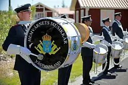 Hemvärnsmusiken (English: Home Guard Music) is a division of the Home Guard that heads all 25 bands. It is led by the Home Guard's central music council and performs at 600-700 events each year. There are over 1,000 active musicians in the division.[2][3] 17 bands are qualified for performance at state ceremonies, royal visits and festivities. Aside from the official bands, Home Guard Bugle Bands also are in service within their respective areas.