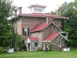 The key contributing property to the district is Henderson Hall. The oldest part of the building is a brick structure built in 1836. This structure was enlarged between 1856 and 1859 to produce Henderson Hall. Built in the Italianate style, the 1850s portion of the structure was designed by J. M. Slocomb[10] and constructed with brick, stone, and timber sourced from the farm.[11] Significant features of the architectural style include deep overhanging eaves decorated with bracketwork, hoodmould decoration around windows, balustrades and stone columns associated with the porch, and a belvedere in the center of the roof. The newer portion of the house incorporates paired windows in three bays.[12] The home's rooms add up to 8,000 square feet (740 m2) of space.[13] The home contains sizable collections of historic items, including material from the 1860 United States presidential election, a wedding dress from 1802, and a piano from 1873.[14]