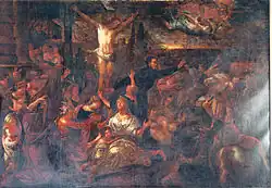 Hendrik Herregouts was highly regarded in his time and he received many commissions for altarpieces and religious works in Flanders and abroad. He was also known as a portrait painter. The majority of his works can be found in churches in Antwerp, Bruges, Mechelen and Cologne. A number of his works in Cologne were lost during World War II.[8] He was influenced by the palette of various artists such as Anthony van Dyck and Peter Paul Rubens as well as by Italian painters such as Titian, Rafael and Caravaggio. Poussin was important as an influence on his classicizing style and overall composition.[8] His works are often on a grand scale and complex. His masterpiece is the Last Judgement in the Church of Saint Anne in Bruges, a very large-scale composition completed in 1685. The colossal figures in the work are reminiscent of the Mannerist painter Raphael Coxie.[10] A Martyrdom of Saint Matthew, originally painted for the Antwerp Cathedral is now in the St. Paul's Church, Antwerp.[11] A Divine Friend of Children dated 1680 in the Göttweig Abbey near Krems in Lower Austria shows his mastery of colour and composition.[8]