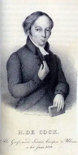 In 1829, Hendrik de Cock (who is also known as the father of the Secession)[5] became minister of the Dutch Reformed Church in the town of Ulrum,[6] near the city of Groningen. He was not evangelical but his congregation was. One of the members gave him the Canons of Dordt to read; this, plus his own discovery of John Calvin's Institutes of the Christian Religion, led to a great change in his preaching.[1]