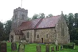 It is thought that the roof would have been thatched at one time but is known to have been tiled since 1900. As one approaches the church, the perpendicular style tower can be seen. From the inscription above the west door asking for prayers for Thomas Sekeford (Seckford) and his second wife Margarete, it can be assumed that it was built at his expense. The Seckford arms, a pair of scissors or shears, appear between the letters. He died on 23 November 1505 and is buried at Great Bealings. The Seckford family gave generously to the town of Woodbridge. On the left, a symbol of a key links with St. Peter. The west window was repaired in 1872 but the original shape was retained. the decorative flintwork on the buttresses of the tower is considered to be a good example of such work. The stone and flintwork of the tower were refurbished in 1980 at a cost of £9,000. This included cleaning and repointing the Elizabethan brickwork around the top of the tower. The flag pole came from HMS Ganges in 1902, a naval training establishment in Shotley for a number of years. This is surmounted by a weathervane in the form of St. Peter's Key. Also on top of the tower is a plaque recording the replacement of the lead on the tower in 1772. The "plummers" bill for the work was £18 18s 9d. Recently both the flagpole and weathervane have had major repair work, resulting in removing, repairing and replacing the lead on the tower. The present electric clock was installed in 1973 and made to strike the hours in 1976. For up to 300 years there was a turret clock with a six-foot pendulum which needed to be wound up regularly. This was taken out when the electricity arrived. In June 2008 the clock was completely replaced with an up to date 24-hour system. Between the tower and the porch on a corner stone nine feet above ground level can be seen an old scratch dial (or sundial); a similar one can be found on the right of the porch entrance.