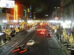 The street has achieved iconic status in Minneapolis culture, memorialized in songs by Tom Waits, The Hold Steady and Lucinda Williams, among others. Its 600 block downtown was once home to Block E, a sometimes-rowdy collection of bars and independent businesses ultimately acquired by the city and demolished in 1988.[6] It is also a popular parade route, used by the annual Aquatennial celebration held in July, and since the 1990s has been the traditional route of the city's LGBTQ Pride parade.