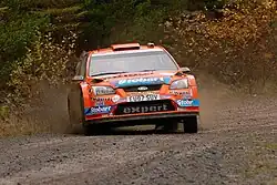 Solberg driving a Ford Focus RS WRC 08 at the 2009 Rally GB.