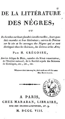 Later, he was recognized for his work De la littérature des Nègres, which aimed to highlight the intellectual ability of black writers.[9] In 1810, the encyclopedia was published in New York City in an English translation by the Irish republican exile in Paris, David Bailie Warden.[10]