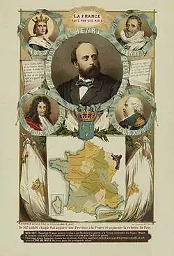 Legitimists relied not only on the color white but also on the formula. Henri IV was seen as a model to be proposed to the pretender to the throne of France under the name of Henri V, the Comte de Chambord. In 1852, for example, Comte de Falloux wanted the pretender to pronounce "some happy words in the manner of Henri IV".[49]