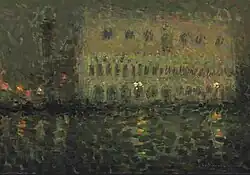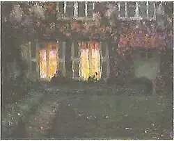Le Sidaner held successful solo exhibitions at one of George Petit's Galleries in 1897 and at the La Libre Esthétique in Brussels in 1898. He was keen to buy a country property where he could create a garden and work in reflective solitude. It was on the advice of ceramist Auguste Delaherche that he rented a neglected property at Gerberoy in the Picardy countryside that he subsequently bought in 1904.[19] Once at Gerberoy, Le Sidaner rarely painted figures again preferring to create impressionistic moods through objects that imply human presence.[20] He also set upon the creation of a magnificent garden to rival Monet's at Giverny.[21] In 1902 Le Sidaner joined his old friend Eugène Chigot for an extended visit to Gravelines and Gisors[22] The preference for a few years was to avoid the harsh Oise winters and encamp to milder climes. In 1903 Le Sidaner spent the winter at Chartres and in 1906 in Venice where according to his biographer Mauclair he completed some of his greatest masterpieces.[2] They include a series of nocturne paintings: Le Grand Canal, Le Palais ducal, Le Palais Rouge and the vivid, mysterious La Sérénade, (1906). This series of paintings were highly acclaimed as examples of Le Sidaner's ability to capture atmospheric lighting effects, using dappled brushwork to create a sense of the luminosity of twilight.[3]