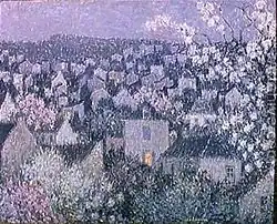 In Paris he studied under Alexandre Cabanel, one of the most influential teachers of belle époque French painting.[5] Although Cabanel mainly painted in an academic style, that were dismissed derisively as L'art pompier (literally ‘Fireman art’) by some critics,[6] he possessed a deep knowledge of nineteenth century French art, in particular of En plein air painting[note 2] and the naturalism of the Barbizon School.[7] According to his biographer Le Sidaner saw Manet's final exhibits at the Paris Salon and was deeply reflective at what he saw in the modernist Manet's work. The result was that Le Sidaner resigned from Cabanel's school, on the grounds of artistic differences.[2] Le Sidaner's interests in the use of colour, softness of form and in painting in the gloaming light were formed during this period as he sought an artistic cure in naturalism and En plein air painting.[8]