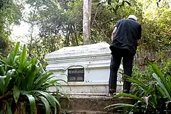During the years of the Second Indochina War Mouhot's tomb was consumed by the jungle and lost until it was rediscovered in 1989 by French scholar, Jean-Michel Strobino, together with Mongkhol Sasorith, a Lao historian. Strobino organised restoration of the monument with the support of the French embassy and the Municipality of Montbeliard, Mouhot's birth town. A new plaque was fixed to one end of the crypt in 1990 to commemorate this rediscovery. The location is now known to hotels and tourist operators in Luang Prabang, and a minivan or "tuk tuk" may be hired to take one the 10 km from town to visit it. This entails a walk down a steep track to the left of a sharp bend on the road to Luang Prabang Railway Station. Passing several small restaurants that now operate along the river at this point and then up a well-cleared track to the tomb, altogether about 250 meters (2025).