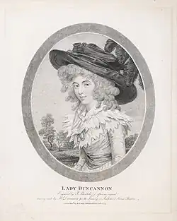 Their marriage was turbulent because Duncannon was abusive. Fluctuating between sweet or obsessive attentiveness, neglecting Harriet entirely, or physically abusing her, Duncannon's abuse of his wife was so public his family could not keep up appearances by pretending it was not occurring.[2] Duncannon's abuse was so widely known that Harriet's serious illness in 1791 made society gossip that he was trying to poison her.[3] Tired of Duncannon's abuse and craving love in her life, Harriet began a disastrous affair with Richard Brinsley Sheridan. This affair was indeed catastrophic for Harriet, as the worst-case scenario actually happened: the abusive Duncannon walked in on Harriet and Sheridan having intercourse. Violently enraged, Duncannon immediately wanted to divorce Harriet. Divorce in the 18th century was social ruin for women, and Harriet narrowly escaped such calamity only when Duncannon's father William Ponsonby, 2nd Earl of Bessborough and the powerful Cavendish clan sided with Harriet, meaning it would be social suicide to divorce her.[4]