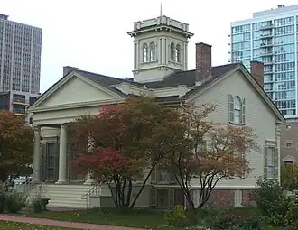 The Henry B. and Caroline Clarke/Bishop Louis Henry and Margaret Ford House or Clarke-Ford House is a Greek Revival style home, now serving as a house museum in Chicago, Illinois, United States. Built around 1836, it is considered the oldest existing house built in Chicago. Henry Brown Clarke was a native of New York State who had come to Chicago in 1833 with his wife, Caroline Palmer Clarke, and his family. He was in the hardware business with William Jones and Byram King, establishing King, Jones and Company, and provided building materials to the growing Chicago populace.[2] The house was built by a local contractor, probably John C. Rue, who later married the Clarkes' housemaid, Elizabeth (Betsy) Saunders.