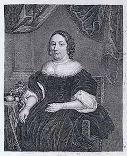 Rachel, daughter of Francis Fane, the first Earl of Westmoreland. She was first married to Henry Bourchier, Earl of Bath; secondly, to Lionel Cranfield, the third Earl of Middlesex, who succeeded his brother James in 1651. Lionel died without issue by her, 26 Oct 1674. I have seen her picture at Basilden, in Berkshire [near Granger's Shiplake], among the ancestors of the late Lord Viscount Fane. She is said to have left a very large sum to build a private chapel, but the money was never applied to the use for which it was intended. Lord Fane used to speak of her as a very good woman. Her portrait was painted by Vandyck, in the reign of Charles I. The print should have been inscribed, "Lady Rachel Fane, or Rachel Countess of Bath." Anachronisms of this kind are too common upon portraits.[34]