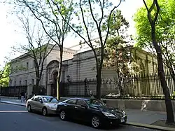 The south wing is two stories high and contained the house's porte-cochère. The western elevation of the south wing is two bays wide and protrudes slightly from the central wing.[62][64] At the first story, the south wing is rusticated, and there are triangular pediments above the western elevation's windows.[62][1] On the 70th Street (southern) elevation of the south wing, there are rectangular windows topped by bas-reliefs, similar to the facade of the central section.[62] At the far eastern end of the south wing's 70th Street elevation is the museum's main entrance, originally the porte-cochère's entrance, which is topped by an ornate tympanum.[62] The tympanum, sculpted by Sherry Edmundson Fry to designs by the Piccirilli Brothers, depicts a female figure modeled on Audrey Munson.[60] When the house was built, the porte-cochère was set back significantly from the street and was enclosed by a pair of metal gates; a barrel vault led north to another entrance at 71st Street.[64] The rear facade of the house faced the porte-cochère.[30] After the house was converted to a museum in the 1930s, the tympanum above the porte-cochère entrance was moved forward, closer to 70th Street.[62][66]