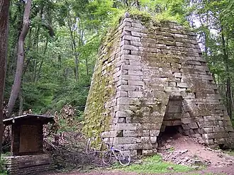 Henry Clay Furnace is an historic iron furnace located in Cooper's Rock State Forest near Cheat Neck, Monongalia County, West Virginia. It was built between 1834 and 1836 by Leonard Lamb.[2] It is a 30-foot square, 30 feet high stone structure in the shape of a truncated pyramid. It was the first steam-powered blast furnace to be built in Western Virginia and had a capacity to produce 4 tons of pig iron per day.[2] In 1839 it was sold to the Ellicott Brothers, who also purchased the Jackson Ironworks at the same time. They made significant improvements, such as connecting it via tram lines to their ironworks at Ices Ferry.[3] It supported a community of approximately 100 people (some sources say as many as 500 people with 100 dwellings[4]). The small settlement included a school, store and a church.[5] No structures apart from the furnace exist today.[2] It is believed to have ceased production in 1847-48 when the Ellicott's business failed.[2] The furnace may have continued to operate until 1868 when all the Cheat River iron works ceased production.[4] It is among the ten or more abandoned iron furnaces still existing in northern West Virginia.[4]