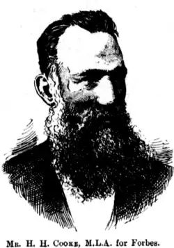 2. ^ "Parliamentary portraits: Mr H H Cooke MLA for Forbes". Australian Town and Country Journal. 16 April 1887. p. 13. Retrieved 6 July 2021 – via Trove.