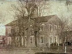 The third courthouse, designed by John Ora, was built by Calvin Sweeney at a cost of $42,000 and completed in 1852.[1][5] The building was made of red brick, had two stories and included a central hall and dome.[1] It was rectangular, the two longer facades facing north and south, and had a cross-gabled roof. A public well was located on the west side of the courthouse lawn.[7]