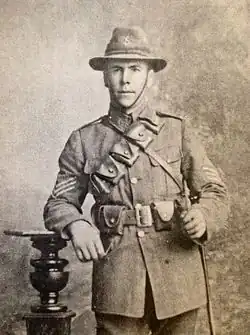 Dewar enlisted early, joining the New Zealand Expeditionary Force leaving on 15 August 1914 for German Samoa.[31][32] On his return he volunteered again, joining the 9th Wellington Mounted Rifles as a machine gunner and was based at Awapuni Racecourse, Palmerston North; he was promoted quickly to sergeant. On 16 October 1914, after training, Dewar embarked on the Orari at Wellington en route for Egypt.[33] There, Dewar captained the Wellington Mounted Rifles rugby team in several matches against other regiments — beating the First Australian Light Horse, the Canterbury Mounted Rifles, and the Auckland Mounted Rifles[34] — before his regiment landed on 8 August 1915 at Anzac Cove, Gallipoli.[4][35] Twenty-four hours later, on 9 August 1915, Dewar lost his life in the assault on Chunuk Bair — Albert Downing was killed in the same action, the first All Black to be killed in the war. Sergeant Henry Dewar is commemorated on the Chunuk Bair (NZ) Memorial Turkey (Panel 4).[35]