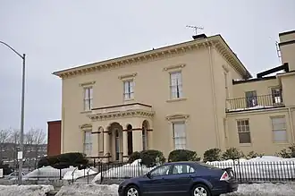 The Henry Goulding House is located on the northern fringe of downtown Worcester, on the east side of Harvard Street at its junction with Dix Street. The building is now a large multisection structure, extending for some length along the road. The original mansion block is located at the northern end, with an early 20th-century addition in the middle, and a 1970s modern section at the southern end. It is a two-story frame structure, with a low-pitch hip roof and stuccoed exterior. The roof eave is adorned with modillion blocks. The main facade is three bays wide, with sash windows arranged around the center entrance. The ground floor windows are flanked by slender pilasters and have bracketed sills and a gabled and bracketed lintel; the second floor windows are more simply framed, with a projecting sill and projecting bracketed cornice. The entrance is sheltered by a portico with round-arch openings and a roof with modillioned cornice and balustrade.[2]