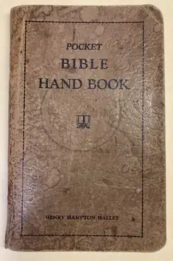 Halley began his Bible Handbook in 1924, at which point it was only a 16-page pamphlet of introductory material, called "Suggestions for Bible Study".[4] After Halley distributed 10,000 free copies, he published a second edition that had grown to 32 pages. Each edition saw growth and Halley did not charge until it reached 100 pages. Until 1941, Halley supported his ministry and his publications through donations. During World War II, Halley stopped travelling to preach and put together his Bible handbook: "An Abbreviated Bible Commentary, Amazing Archaeological Discoveries, How We Got the Bible, An Epitome of Church History, Select Bible Verses." It was printed by Rand McNally. When the publication rights were transferred to Zondervan in 1960, the handbook had already sold over 5 million copies.[5]