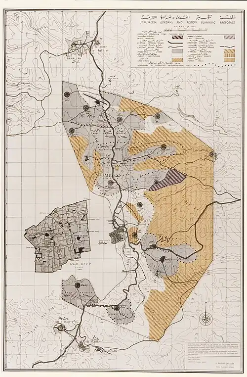 Between 1963 and 1966, Kendall worked for the Jordanian Kingdom[6] – an ex-British colony, that included only areas formerly been in the British Mandatory Palestine. The Jordanians hired Kendall in order to fit his old zoning plan of Jerusalem to the situation in which Jerusalem is divided between two states.[20]