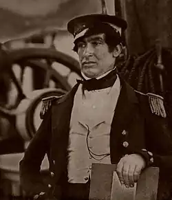 ![]() Lieutenant H.T.D. Le Vesconte in 1845 holding a copy of Marryat's Code of Signals; behind him is the ship's wheel of HMS Erebus, the only contemporary photograph of the ship ever taken[1] | |