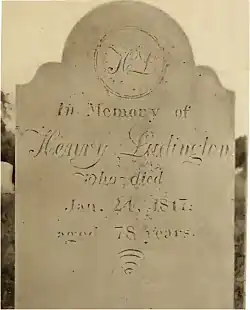 Ludington died at the age of 78 on January 24, 1817, and was buried in the churchyard of the town's Presbyterian church.[10] The grave is marked with a tombstone that has a short inscription:[11]