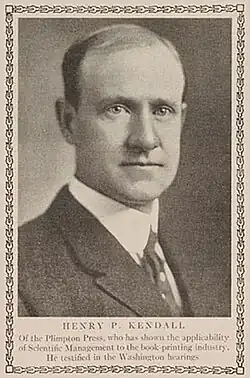 After his graduation in 1899, he started his career at the Plimpton Press company in Norwood, Massachusetts, a company own by his uncle Herbert Mosley Plimpton (1859โ1948). He worked his way up from a minor position to general manager and treasurer in 1910. In this period he had grown an interest in the scientific management techniques of Frederick Winslow Taylor, which he had applied in the Plimpton Press plant. Kendall believed that industrial plants could become efficient when viewed as systems composed of interacting parts but become more efficient in the long-run if the scientific-management philosophy was fully accepted by all parties.[4] This became one of the earliest successful applications of the Taylor system.[3]