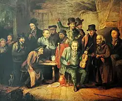 While paintings of local subjects had considerable appeal, there was a danger of such work being considered too parochial. Parker turned to the novels of Walter Scott for inspiration for dramatic incidents. Davie Deans Rejecting the Advice of Saddletree and Butler, drawn from Scott's Heart of Midlothian (first published 1818), was exhibited at the British Institution in 1823,[20] from where it was purchased. Who’s Turn Next? or Vacant Chair, a whimsical work ‘in the style and manner of Wilkie’,[21] was exhibited at Royal Academy in 1824[22] – and bought by Brandling. Comparisons with Wilkie were also made in relation to The Village Raffle, exhibited the following year at the British Institution (where purchased by Hewitson).