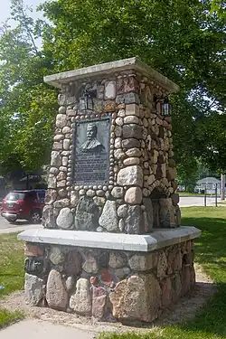 The annual Pattengill Reunion events continued after Pattengill's death. The committee which facilitated these events began to work to promoting Pattengill's legacy, by means such as placing his portrait in Gratiot County schools and creating a state memorial in Pattengill's name.[33] On January 8, 1920, the Detroit Board of Education passed a resolution to build an elementary school named after Pattengill.[34] The school was opened on November 23, 1921.[35] In November 1921, the Michigan State Teachers' Association established high school scholarships in Pattengill's name.[36] In 1924, there was a cairn monument built and dedicated to Pattengill in Ithaca, on land that was once a school building where he taught. It was funded by his former students.[37] It was constructed with 510 stones from around the world. In 2010, it was registered as a Michigan State Historic Site, and a plaque commemorating Pattengill was erected in 2011.[38]