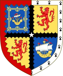 Quarterly: 1st, azure, a ship at anchor, oars in saltire or, flagged gules, within a double tressure counter-flory of the second; 2nd and 3rd, or, a lion rampant gules, armed and langued azure; 4th, azure, a ship under sail or, sails argent and flags gules; over all, dividing the four quarters, a cross engrailed sable, thereon a mullet for difference, Sinclair; the whole within a bordure parted per pale, the dexter side indented gules, the sinister ermine.