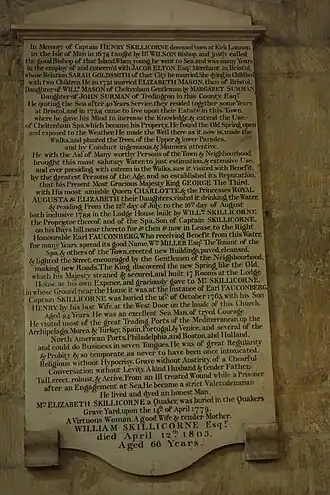 Henry Skillicorne (c. 1678–1763) was a Manx-born merchant mariner who after some four decades trading out of Bristol began a second career as the first serious developer of the spa waters in Cheltenham. Regarded as 'the founder of Cheltenham as a watering place' in all the standard histories of the town,[1] his memorial inscription in the parish church, standing at 53 lines and almost 600 words, is one of the longest in Britain, and has been transcribed and reproduced many times.[2]
