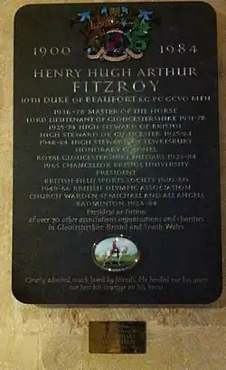 Henry Hugh Arthur FitzRoy Somerset, 10th Duke of Beaufort (4 April 1900 – 5 February 1984), styled Marquess of Worcester until 1924, was a peer, landowner, society figure and a great authority in the fields of horse racing and fox-hunting. He held the office of Master of the Horse for over forty years (1936–1978), the longest to hold the position. He founded the Badminton Horse Trials and was deemed "the greatest fox-hunter of the twentieth century";[1] his long tenure as Master of the Beaufort Hunt led to his being universally nicknamed Master and his car bore the private numberplate MFH1. In 1980 he published the authoritative book Fox-Hunting.